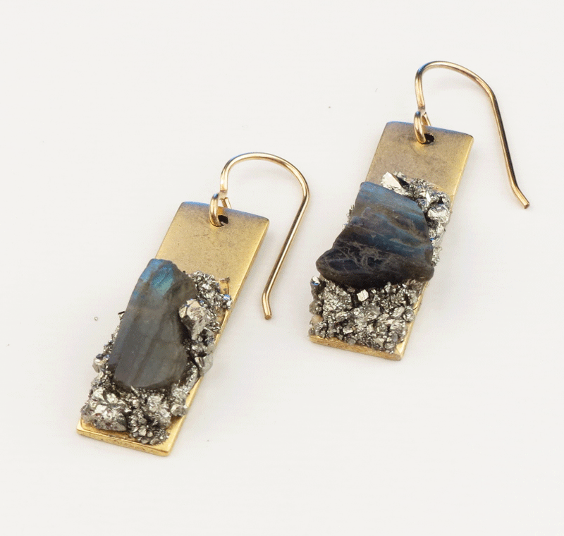 Mysterious labradorite is surrounded by glittering pyrite dust in a rustic, geometric gold-plated earring setting. 1 1/4 inches long; 3/8 inches wide. Style E673L $50.00 -Option- Greenapatite/silver Labradorite/gold