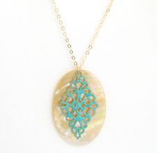 Mother-of-pearl oval with a patina scroll-filigree overlay on 14k gold-filled chain. 18" with 2" extension. *Only 1 left! Style N558P Was $58.00 Now $41.00 Patina Gold